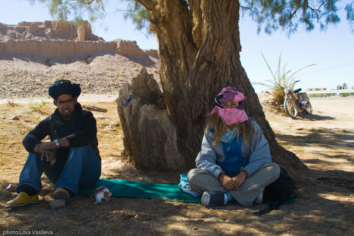 След Казабланка се бяхме запътили към Маракеш, но момчето, което ни качи ни покани в дома си близо до Оарзазат и решихме да приемем. Пътувахме с него повече от 400 км, преспахме по средата на пътя в планината в един ресторант и на сутринта продължихме. (оказа се, че доста хора хапват и заспиват на удобните миндерчета в ресторанта и продължават пътя си на другия ден). Пътят беше тесен, с много завои, изсечени в скалистата планина. Малко след Оарзазат Рашид (шофьорът) излезе от пътя на един завой и спукахме две гуми. Сменихме едната, а с другата Рашид хвана стопа към гумаджияа в най-близкото село, докато ние го чакахме при колата. След няколко часа всичко беше наред, гумите (с лети джанти) бяха изправени с чук и продължихме пътя.